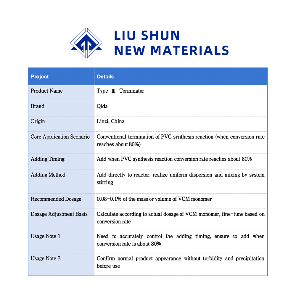 يتم إضافة هذا المنتج عندما يصل معدل تحويل تخليق PVC إلى 80% تقريبًا، وتكون الجرعة هي حجم مونومر VCM. 0.08-0.1%.