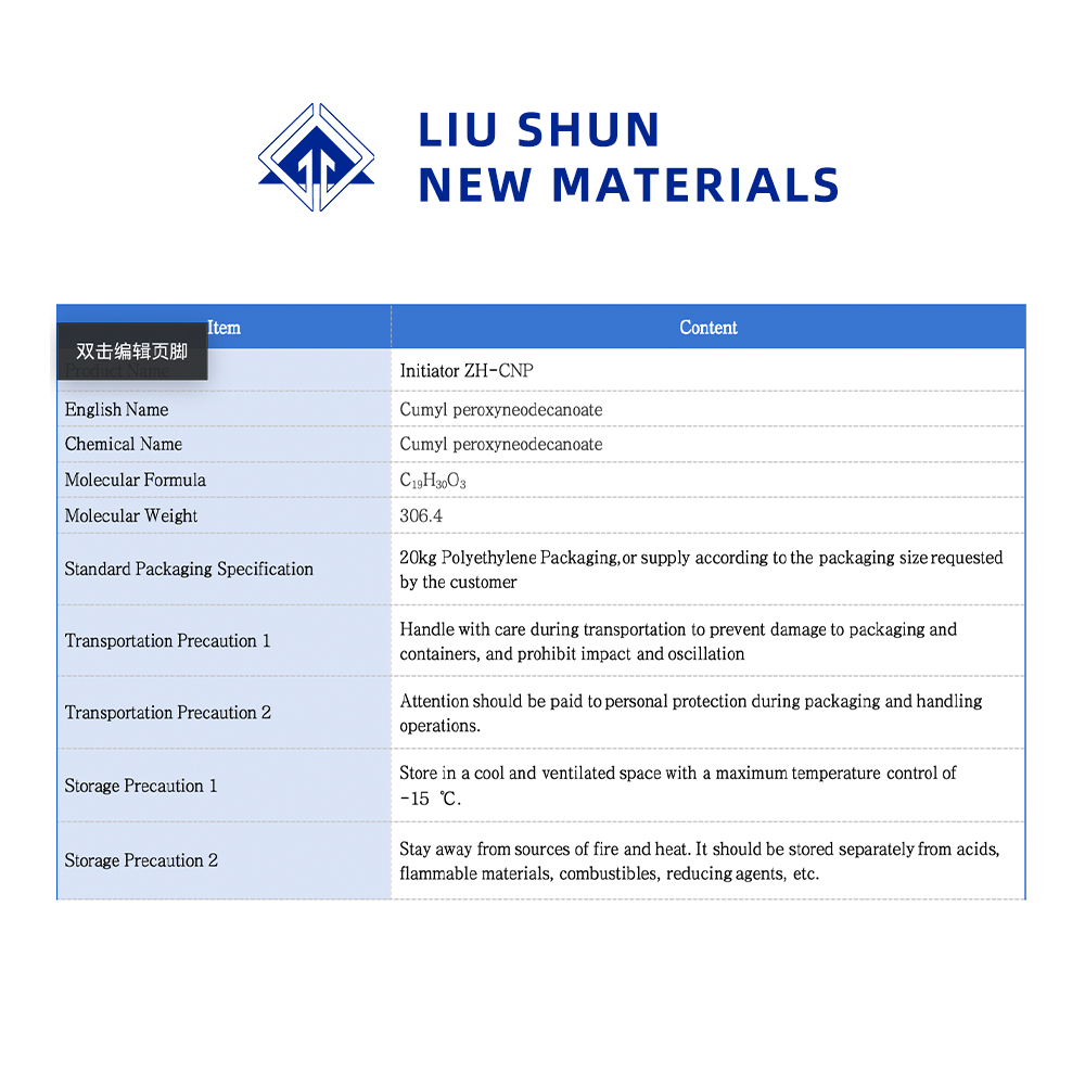 هذا المنتج عبارة عن بادئ عالي الكفاءة لبلمرة LDPE، ويستخدم على نطاق واسع في عملية تفاعل الأنبوب والغلاية، نطاق درجة الحرارة المطبق 130-170 درجة مئوية.