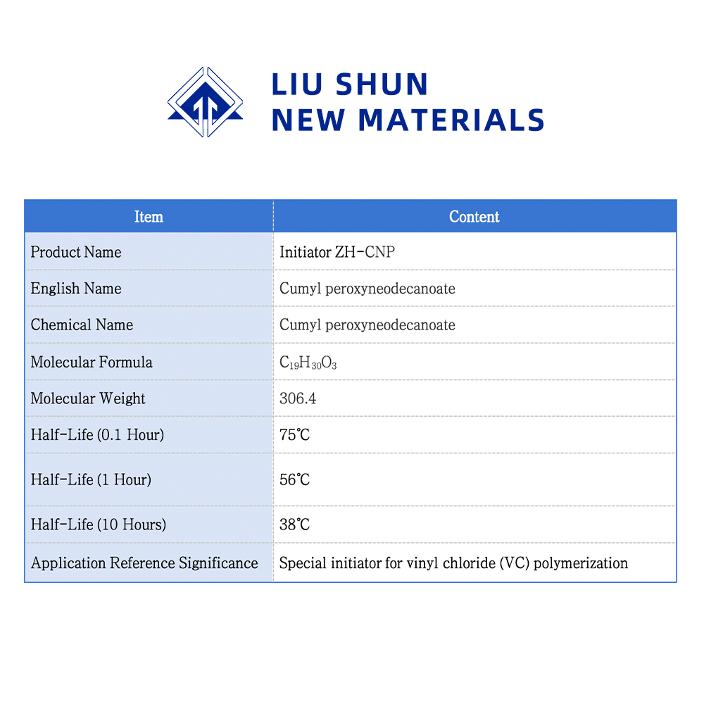 هذا المنتج مناسب لعملية بلمرة المعلق المائي لكلوريد الفينيل عند درجة حرارة 40-65 درجة مئوية. وهو بادئ مهم ونشط للغاية لكلوريد الفينيل.