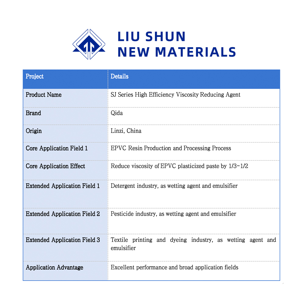 بعد الانتهاء من بلمرة المستحلب لراتنج EPVC، أضف 0.1-1% من حجم المستحلب كمخفض لزوجة عالي الكفاءة SJ. يتم بعد ذلك تقليب الخليط وتجفيفه للحصول على راتينج EPVC ذو لزوجة أقل. بدلاً من ذلك، أثناء تحضير ملاط راتنج EPVC، أضف 0.5-2% من حجم الراتنج كمخفض لزوجة عالي الكفاءة DF يعتمد على مستوى اللزوجة لتحقيق الاتساق الأمثل. لاحظ أنه يجب تسخين مخفض اللزوجة عالي الكفاءة SJ قبل الاستخدام عندما تكون درجة الحرارة المحيطة أقل من 10 درجات مئوية للحفاظ على سيولة جيدة للتطبيق.