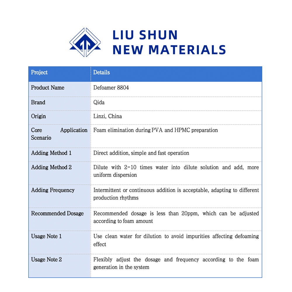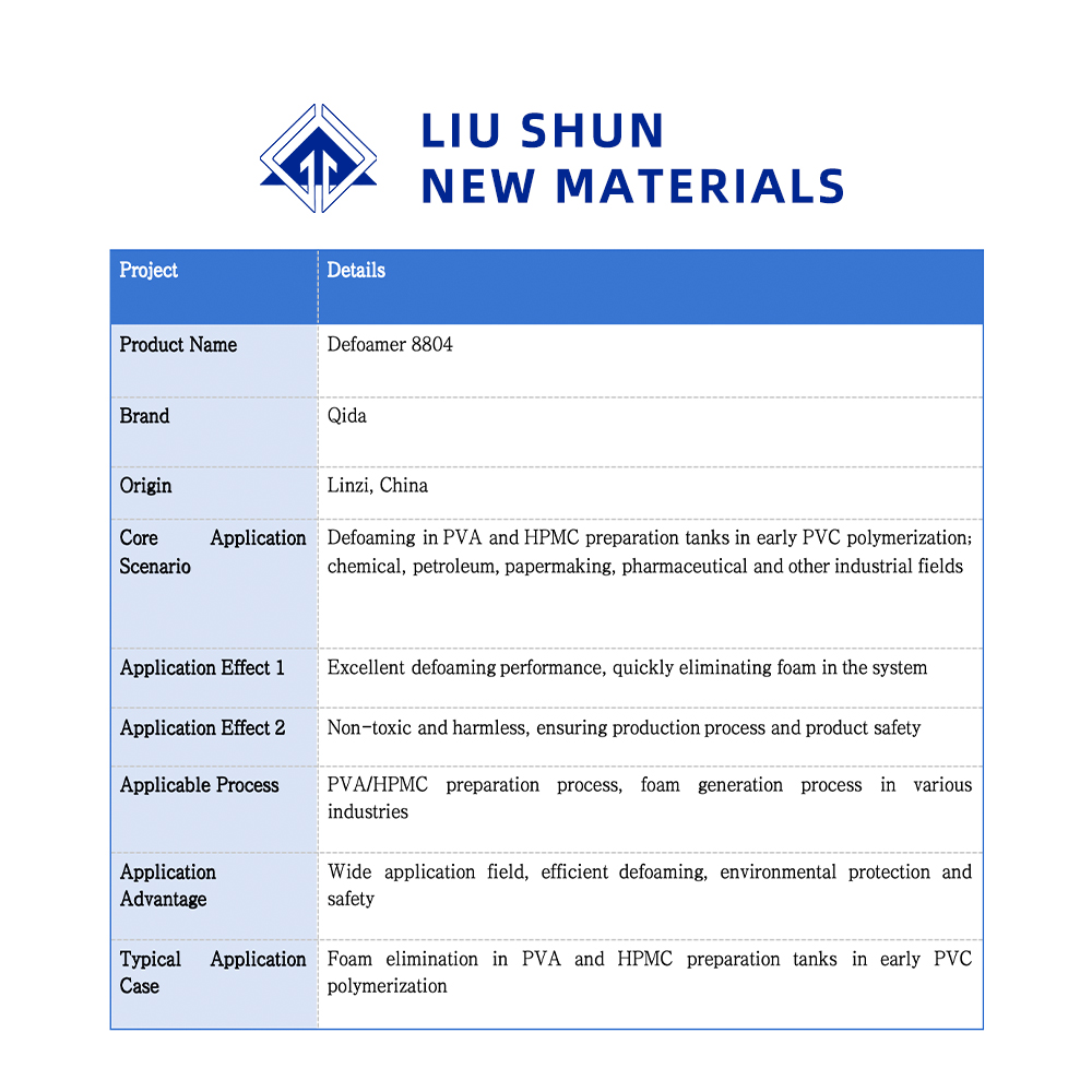 Defoamer 8804 عبارة عن مادة خافضة للتوتر السطحي غير أيونية تعتمد على البولي إيثر ويتم تصنيعها من خلال التفاعل التحفيزي للبوليول مع أكسيد البروبيلين وأكسيد الإيثيلين. كونها غير سامة وغير خطرة، فهي تعرض أداء ممتاز لإزالة الرغوة وتستخدم على نطاق واسع في مختلف القطاعات الصناعية بما في ذلك الصناعات الكيميائية والبترولية وصناعة الورق والصناعات الدوائية. أثناء عملية بلمرة PVC، يزيل مزيل الرغوة هذا بشكل فعال تكوين الرغوة في خزان الخلط عند تحضير PVA وHPMC.