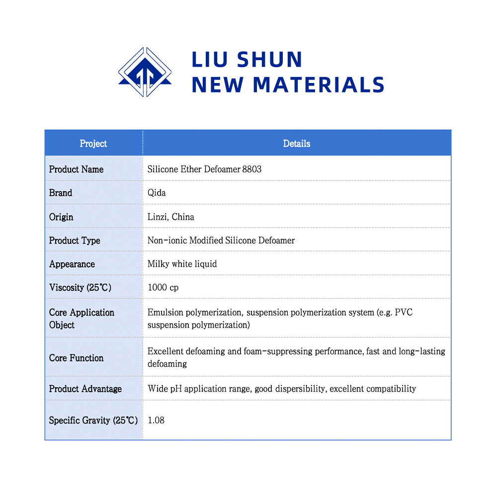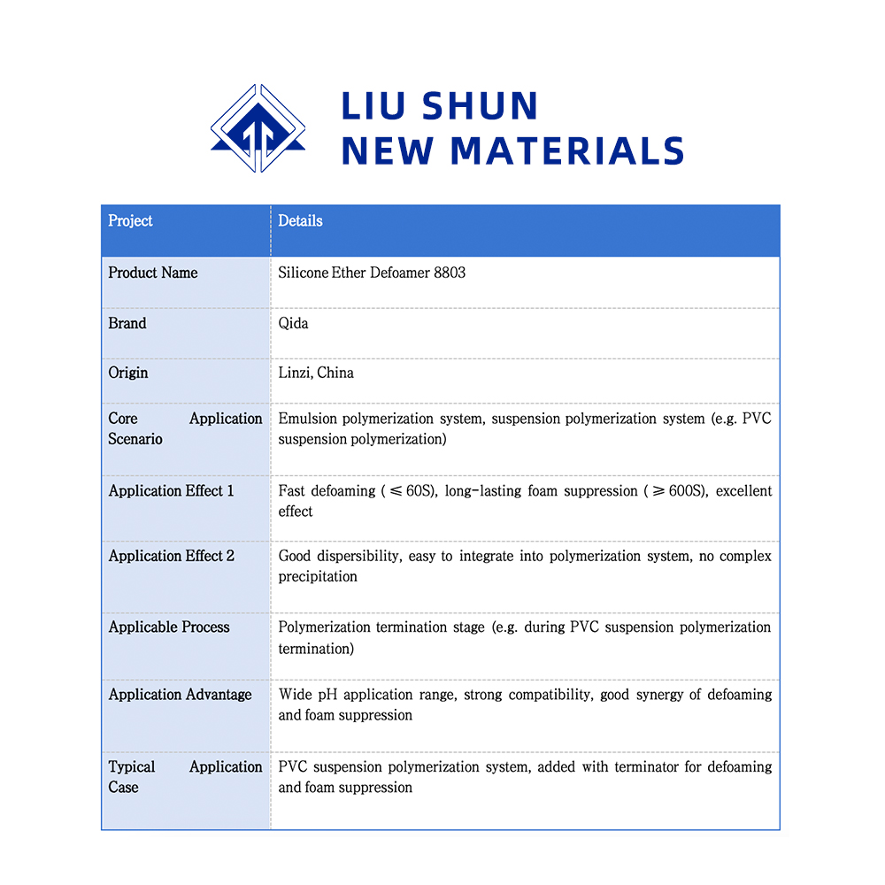 باعتباره عامل إزالة رغوة غير أيوني، يُظهر 8802 توافقًا استثنائيًا مع المواد الخافضة للتوتر السطحي الكاتيونية والأنيونية بالإضافة إلى أنظمة البوليمر، دون تكوين رواسب معقدة. على سبيل المثال، أثناء بلمرة تعليق كلوريد البوليفينيل، يمكن إضافته إلى النظام إما جنبًا إلى جنب مع جهاز الإنهاء أو إضافته مسبقًا إلى جهاز الإنهاء قبل الإنهاء.